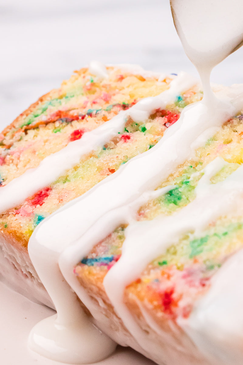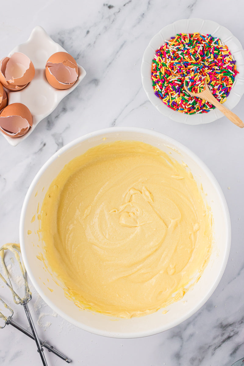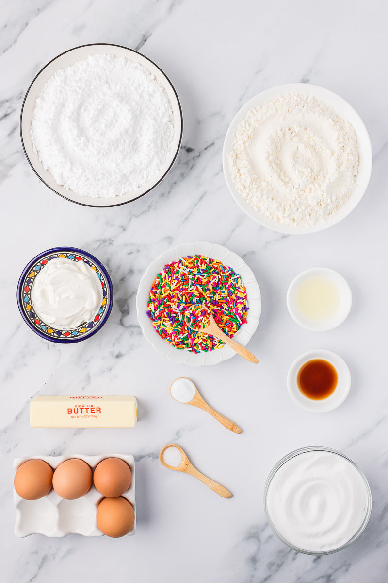 Ingredients: flour, sugar, unsalted butter, eggs, rainbow sprinkles, sour cream, lemon juice, vanilla extract, baking powder, salt, powdered sugar