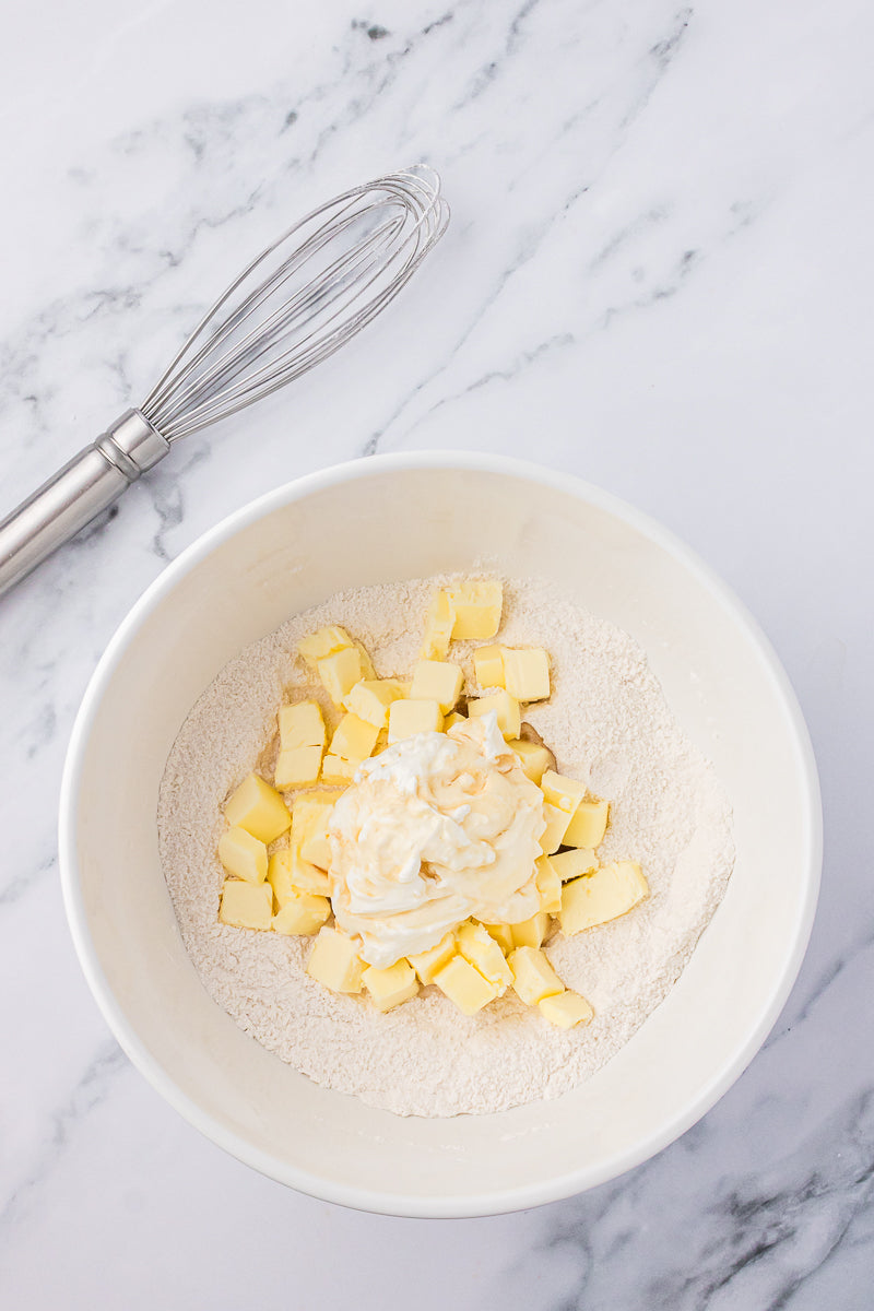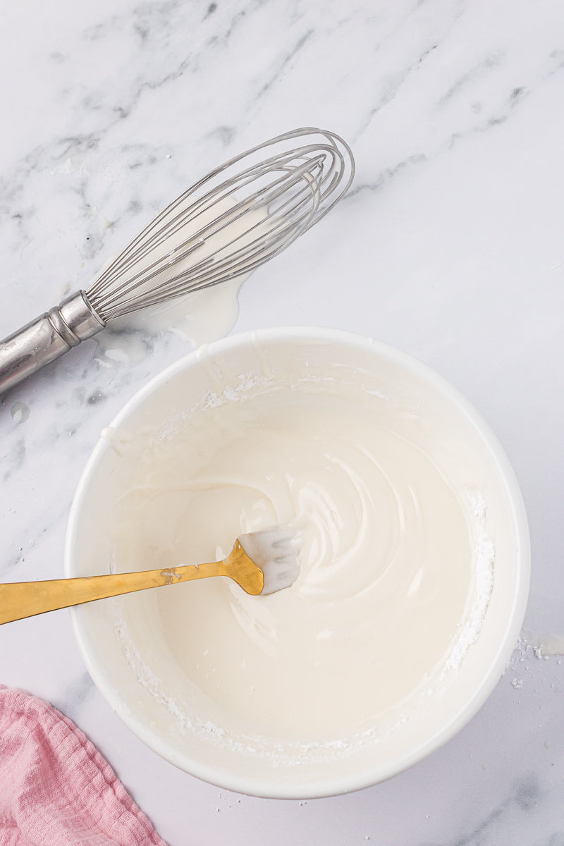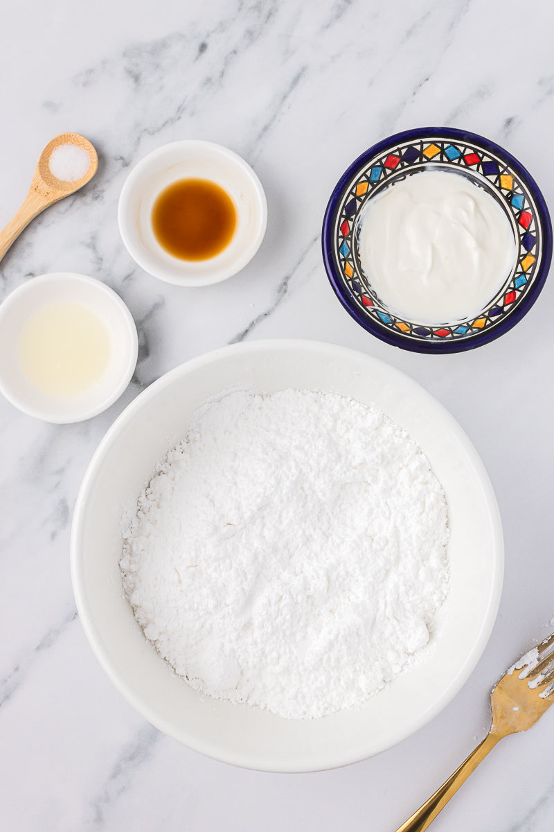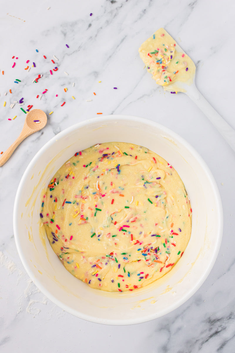 Ingredients: flour, sugar, unsalted butter, eggs, rainbow sprinkles, sour cream, lemon juice, vanilla extract, baking powder, salt, powdered sugar
