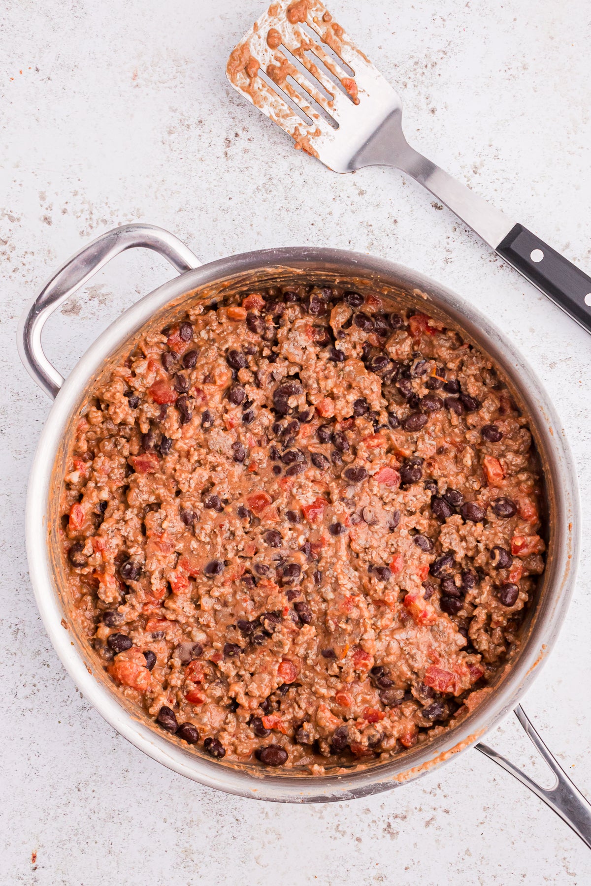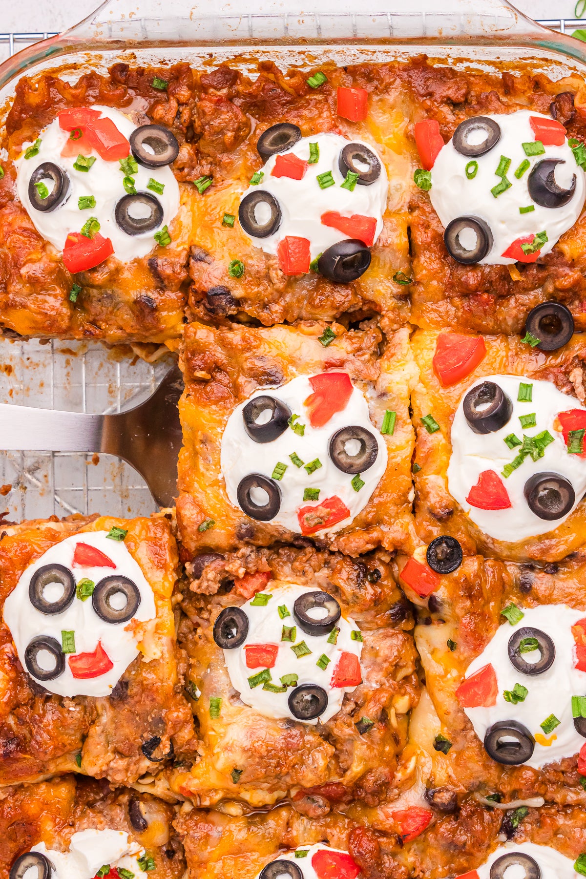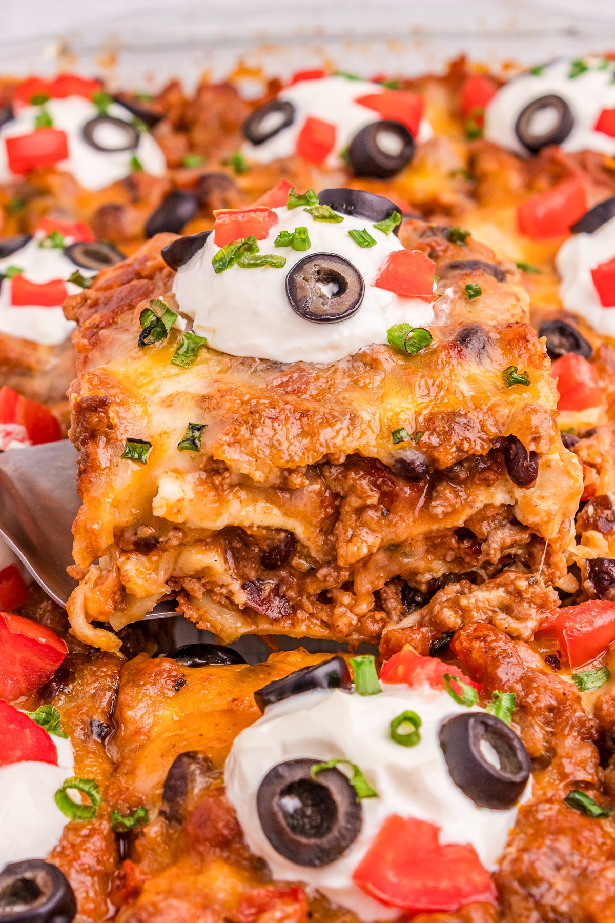 This hearty lasagna is a twist on the classic: it is stuffed full of taco-seasoned ground beef, beans, two kinds of cheese, baked in enchilada sauce, and topped with sour cream, tomatoes, green onion, and olives. It’s like 7-layer bean dip in lasagna form!