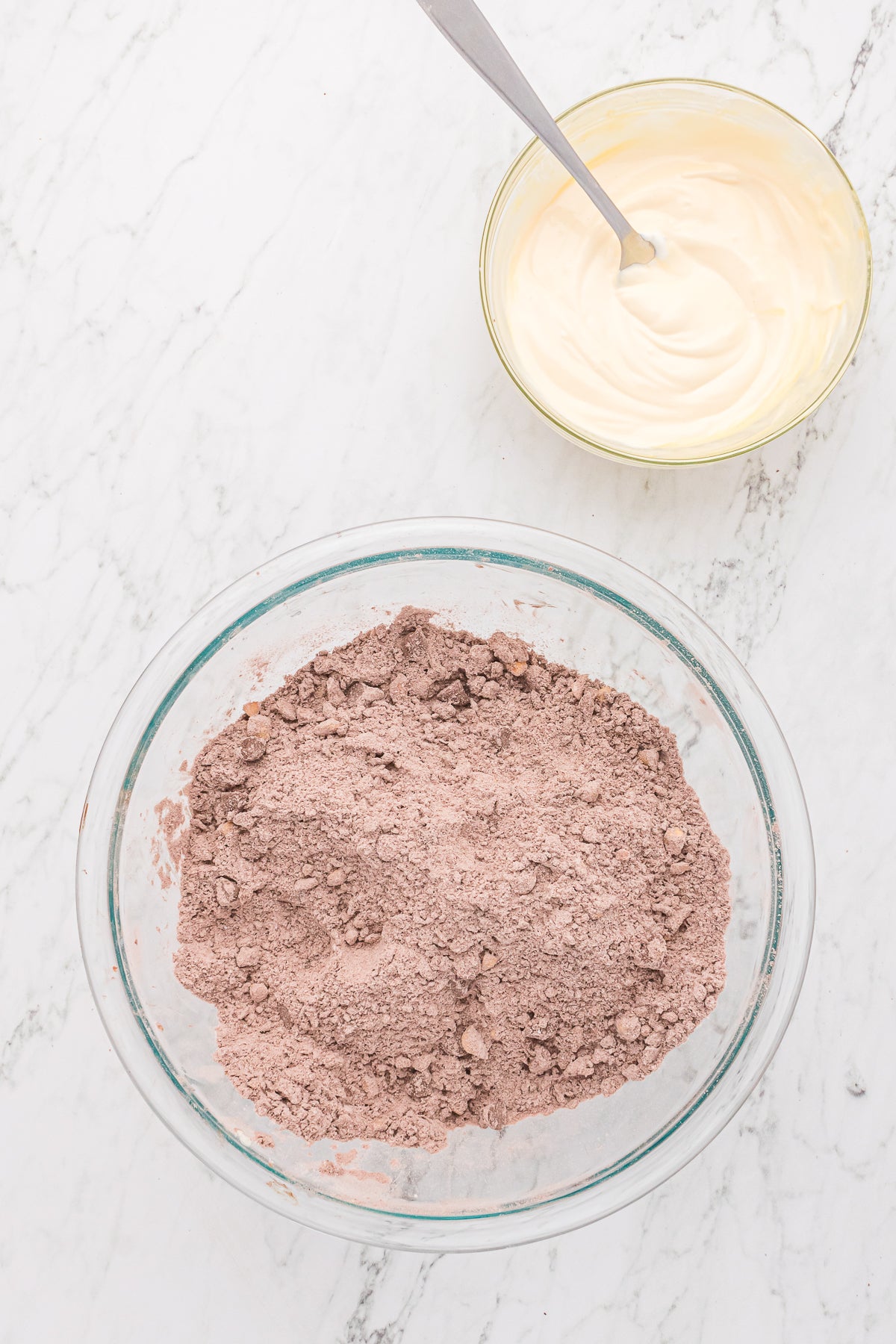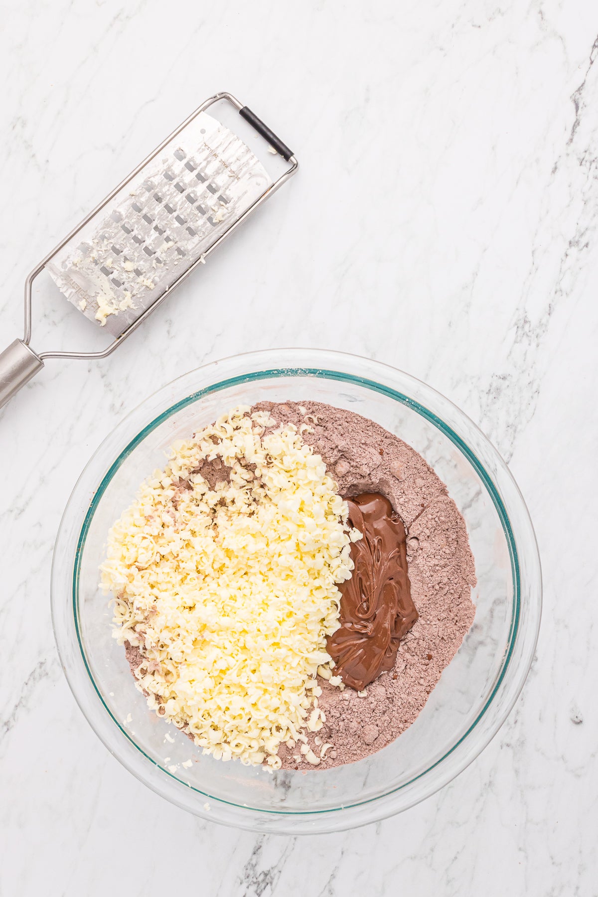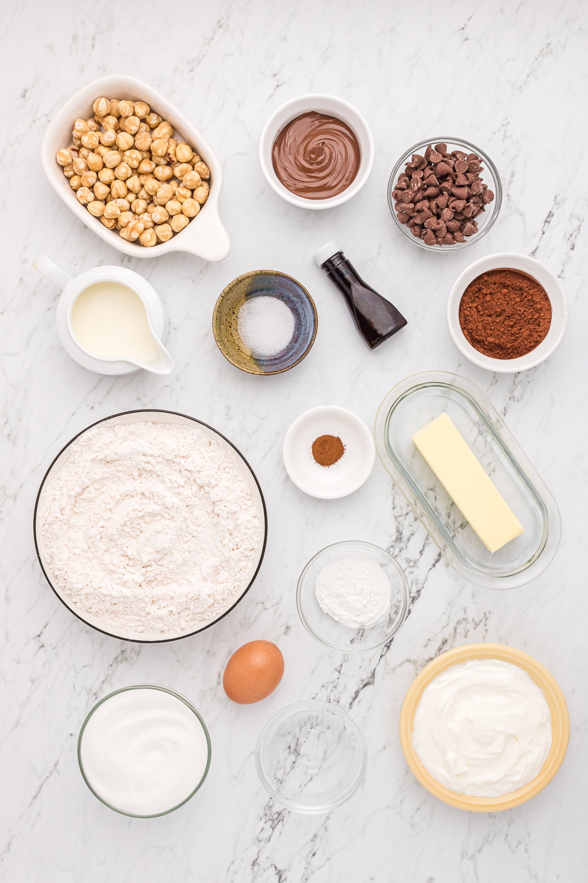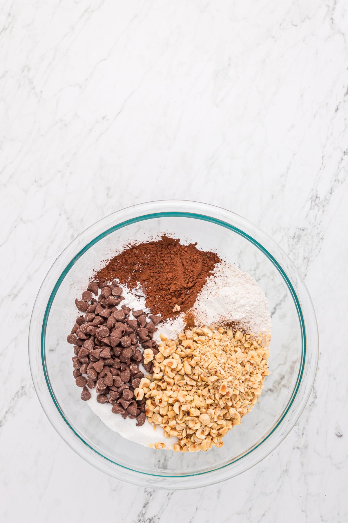 Ingredients: flour, dutch-process cocoa powder, instant espresso powder, hazelnuts, milk chocolate chips, Nutella, unsalted butter, egg, sour cream, vanilla extract, heavy whipping cream, sugar, baking powder, salt
