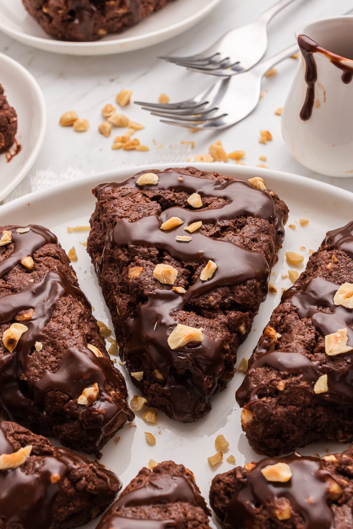 These decadent chocolate scones, with roasted hazelnuts and milk chocolate chips on the inside and rich, creamy Nutella ganache drizzled on top, taste just like giant Ferrero Rochers!